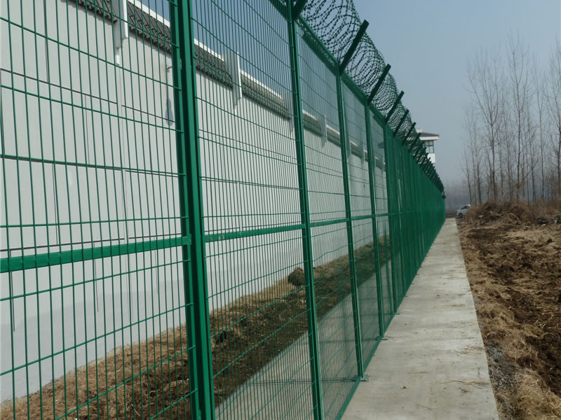 監獄護欄網現被廣泛應用在監獄,軍事基地等高安全場所。注:如果在監獄護欄網頂部加裝刀片刺絲、刀片刺繩后又很好的增強了安全防護性能。采用電鍍、熱鍍、噴塑、浸塑等防腐形式,具有很好的抗老化、抗曬、耐候等特點。其產品造型美觀、花色多樣,既起到圍欄作用,又起到美化作用。由于具有安全性高、防攀爬能力好,網片連接方式采用SBS緊扣件,有效防止人為的破壞性拆卸,橫向四道折彎加強筋,使網面強度大大增加。